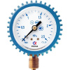 Газовый (сварочный) манометр серии ТМ-210 отечественного производства ЗАО «РОСМА» используется для измерения и контроля давления газа в замкнутой системе с максимальной рабочей температурой до 120°C. Его запрещается использовать в работе с агрессивными, вязкими и кристаллизующимися рабочими средами. Применяется в баллонных редукторах и регуляторах. Прибор имеет диаметр корпуса 50 мм, радиальное исполнение (штуцер снизу), класс точности 2,5 и степень защиты IP40. Корпус газового манометра от РОСМА имеет цветовую индикацию в зависимости от измеряемой среды: кислородный (О2) манометр – голубой корпус; ацетиленовый (С2Н2) манометр – серый корпус; пропановый (С3Н8) манометр – красный корпус; манометр для других газов – черный корпус. Манометр рекомендуется заказывать с защитным кожухом как на фото (это доп. опция).