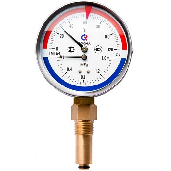 Термоманометры ТМТБ от отечественного производителя ЗАО «РОСМА» — это прибор, объединяющий в себе манометр и термометр, который служит для измерения избыточного давления и температуры неагрессивных жидких сред. Прибор имеет две шкалы (одна для отсчета давления, другая для температуры) и две указательные стрелки. Прибор поставляется вместе с клапаном, который предназначен для подключения и демонтажа прибора. Область применения: в системах отопления, водоснабжении (например, бойлеры для воды, паровые котлы). Термоманометры представлены в ассортименте РОСМА с двумя диаметрами корпуса 80 и 100 мм (ТМТБ-3 и ТМТБ-4), в радиальном и осевом исполнении, и с разной длиной погружной части (L) в зависимости от температуры измеримой среды: 46/ 64/ 100 мм.