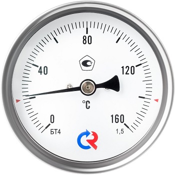 Термометры БТ серии 211 отечественного производства ЗАО «РОСМА» относятся к биметаллическим термометрам, которые служат для измерения температуры неагрессивных жидких и газообразных сред. Корпус приборов выполнен из коррозионностойкой стали со степенью защиты IP43. Область их применения: в системах отопления, кондиционирования, вентиляции. Принцип работы БТ заключается в деформации чувствительного элемента (биметаллической пружины), под действием измеряемой температуры. Биметаллическая пружина в БТ одним концом закреплена внутри штока, а другим присоединена к показывающей стрелке. При изменении температуры она изгибается или распрямляется, двигая тем самым стрелку. Биметаллические термометры с осевым присоединением представлены в ассортименте РОСМА с диаметрами корпуса 63/80/100/150 мм (БТ-31.211, БТ-41.211, БТ-51.211, БТ-71.211), а также с разной длиной погружной части (L) в зависимости от температуры измеримой среды: 46/64/100/150/200/250/300 мм.