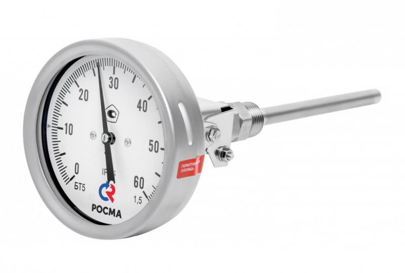 Отечественная компания по производству контрольно-измерительных приборов ЗАО «РОСМА» расширила ассортиментную линейку биметаллических термометров с возможностью гидрозаполнения, добавив в нее исполнение с универсальным присоединением (поворотно-откидной корпус) с резьбой на штоке — БТ-54.220 с ГЗ.